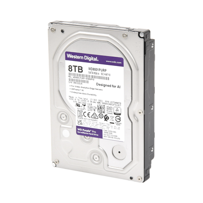 Disco duro WD8001PURP de 8 TB, 7200 RPM, SATA III, optimizado para video vigilancia. Su diseño duradero permite operar en entornos exigentes y ofrece un alto rendimiento. Ideal para sistemas de múltiples cámaras y con 5 años de garantía.