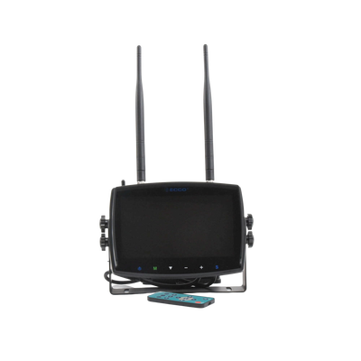 Sistema inalámbrico de reversa EC7010WK de ECCO, ideal para vigilancia. Modelo de cámara EC2030-WC, montaje magnético, carga en 6 hrs, tiempo de descarga de 10 hrs y capacidad de visualización de 4 cámaras. Protección de privacidad y excelente calidad de imagen.