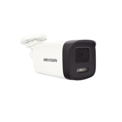 Cámara de seguridad DS-2CE17K0T-LTS, 3K (5 Megapíxel) con lente de 3.6 mm y ángulo de visión de 87°. Posee dual light: 40 mts smart IR y 40 mts de luz blanca, audio bidireccional, micrófono y bocina integrados, con protección IP67 para uso exterior.