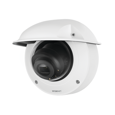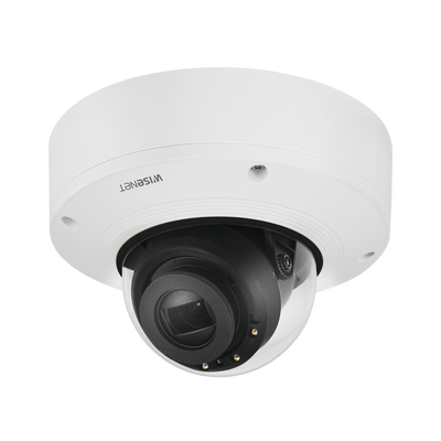 Cámara IP Domo Exterior XNV-6081R de Hanwha Techwin Wisenet, con resolución 2MP y lente motorizado de 2.8-12mm. Ofrece IR de 50m y WDR de 150dB. Ideal para videovigilancia, cuenta con compresión H.265 %26 WiseStream II para ahorrar almacenamiento, y es resistente al agua y al vandalismo (IP67, IK10).