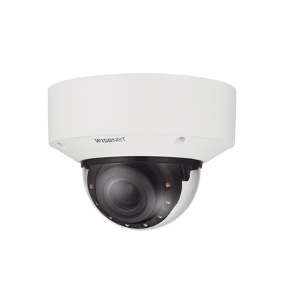 Cámara Domo 2MP XNV-C6083R de Hanwha Techwin, con resolución 1920x1080 y lente motorizado de 2.8 a 12mm. Ofrece compresión H.265, WDR 120dB y certificaciones IP66/IP67/IK10. Ideal para videovigilancia, reduce almacenamiento hasta un 99%25 y proporciona metadatos específicos mediante IA. Visibilidad mejorada en condiciones de baja luz.