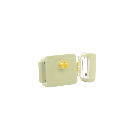 Cerradura eléctrica ACCESSRIML 12 Vca 2.5 A doble cerrojo diseñada para puertas izquierdas. Presenta un pestillo con rodillo en color beige, dimensiones de 129 x 103 x 38 mm y se activa mediante un pulso de voltaje por 2 seg. Mejora la seguridad de su hogar o negocio.