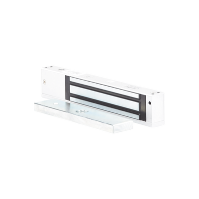 Chapa magnética MAG600NTLED de ACCESSPRO, soporta 600 lbs (280 kg). Con temporizador de 0,3 a 9 segundos, voltaje seleccionable 12/24 Vcc. Consumo de 500mA, eficiente entre 10 a 55 °C. Resistente con acabado de zinc y sensor NO/NC.