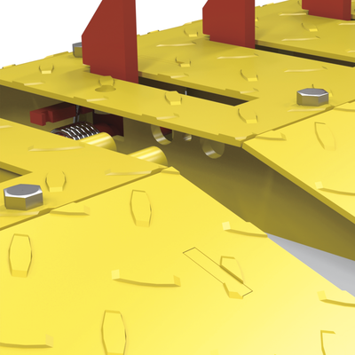 Panel ponchallantas XB-TK-A de acero antiderrapante, ideal para control de tráfico pesado. Soporta 10,000 Kg, con bloqueo por tornillos y activación por resortes. Fabricado en México, medidas 914 x 527 x 58 mm, acabado amarillo electrostático, y velocidad máxima de 8 km/h.