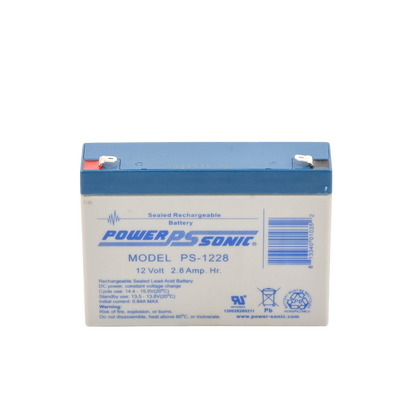 Batería 12V, 2.8AH PS-1228 de POWER SONIC, terminales F1 y diseño libre de mantenimiento con 5 años de vida útil. Voltaje Nominal: 12V, Capacidad: 2.80 AH @20HR, Peso: 1.2 kg y dimensiones de 5.24%22 x 1.30%22 x 3.82%22. Ideal para respaldo en sistemas de seguridad y emergencia.