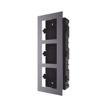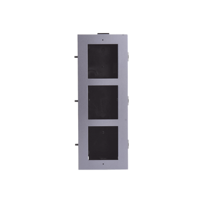 Base empotrable DS-KD-ACF3 de HIKVISION, fabricada con tapa de aluminio y caja de plástico, soporta temperaturas de -40° a 60° C. Sus dimensiones son 338.8 x 134 x 56 mm y permite la instalación de 3 módulos para videoporteros multiapartamento. Ideal para una instalación fácil y rápida.