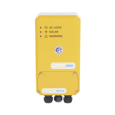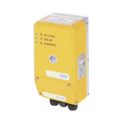 Controlador solar PICOCELL2000 para bomba CA de 0.75 a 1 HP trifásica, 115 o 230 Vca, IP66. Ideal para zonas remotas, permite usar energía solar sin inversor adicional y alimenta cargas inductivas.