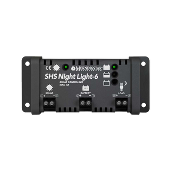 Controlador solar SHS6NL 14.3 Vcc 6 A, ideal para electrificación rural, reduce costos de batería. Desconexión por bajo voltaje (11.5 Vcc) y protección contra corto circuito. Carga compensada en temperatura y bajo consumo de 8 mA.