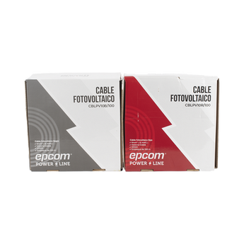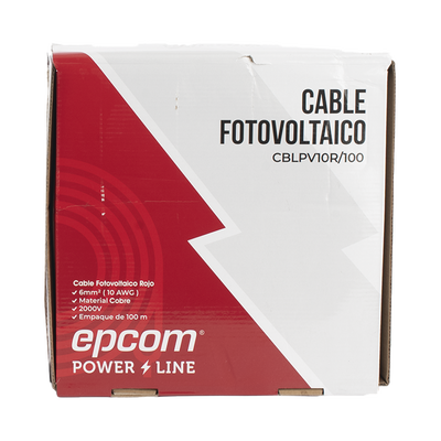Kit de cable fotovoltaico KIT2CBLPV10RB/100 de 100 m, compuesto por dos rollos (uno rojo y uno negro) de cobre calibre 10 AWG (6mm²). Este cable tipo PV soporta tensiones de hasta 1000/2000 V y temperaturas de -40° C a 120° C. Su conductor de cobre suave garantiza alta conductividad y resistencia a los rayos UV y al ozono, asegurando un rendimiento óptimo en las instalaciones fotovoltaicas.