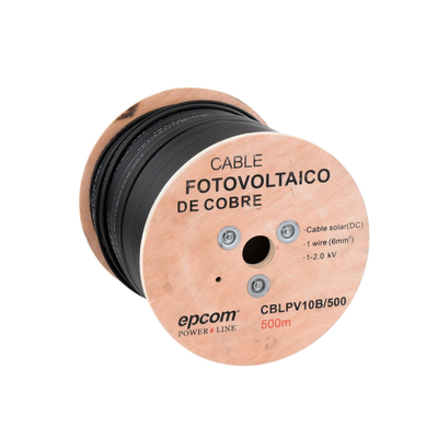 Cable fotovoltaico CBL-PV-10B/500 500 m 6 mm² 2000 V alta resistencia a UV vida útil de 25 años. Modelo: CBLPV10B / 500, longitud de 500 m, conductor de cobre tipo PV, soporta hasta 2000 V y temperaturas de -40 °C a 120 °C. Su flexibilidad y alta resistencia UV lo hacen ideal para instalaciones de gran escala.