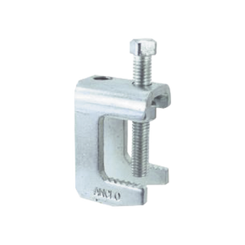 Mordaza acero ANC-MA114-12, fabricada en material AISI 1018, con carga máxima de 300 kg. Diseño reforzado para soportar cargas pesadas y acabado galvanizado que otorga resistencia a la corrosión, ideal para fijarse en estructuras con varilla roscada de 1/2%22.