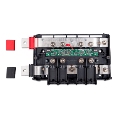 Barra de distribución CD modular con espacio para cuatro fusibles.