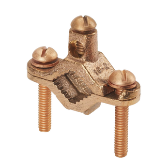 Brida de conexión a tierra de bronce, apta para enterrar directamente en la tierra, rango de tamaño del conductor: n.º 10 SOL - n.º 2 STR AWG, tubo de hierro de 1/2' - 1' (12.7mm - 25.4mm), largo del tornillo de la brida del tubo: 1.65' (41.9mm).