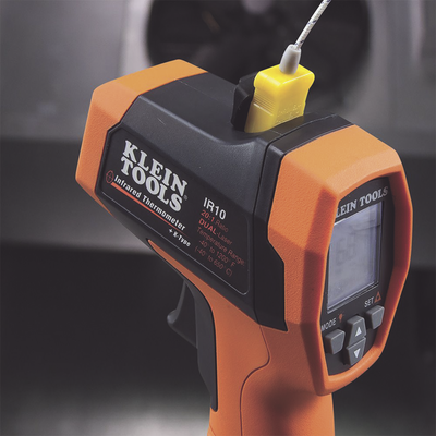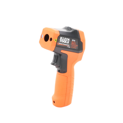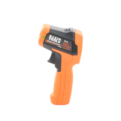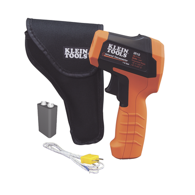 Termómetro infrarrojo IR-10K de KLEIN TOOLS, ideal para medir temperaturas de -40 a 650 °C. Con un diseño compacto (5.82%22 x 1.67%22 x 0.95%22), material ABS y policarbonato, este dispositivo cuenta con doble láser de enfoque, resolución de 20:1 y pantalla retroiluminada. Precisión de ± 2 °C y protección IP54 contra polvo y agua lo hacen perfecto para variadas aplicaciones.