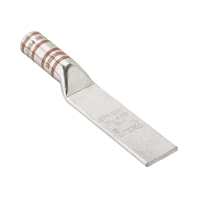 Terminal de compresión LCC750-00-6 de PANDUIT con talón de tambor largo y lengüeta en blanco, ideal para cable de 750 kcmil. Su diseño adapta conexiones eléctricas y permite personalización, facilitando la identificación de conexiones.