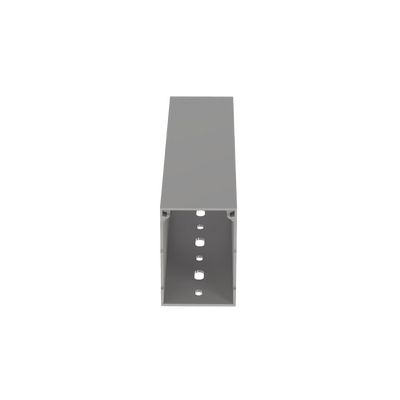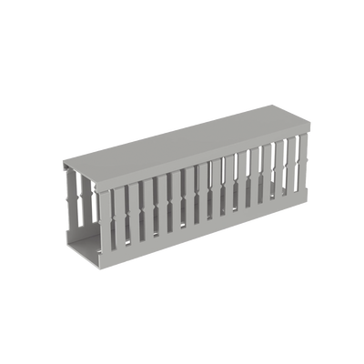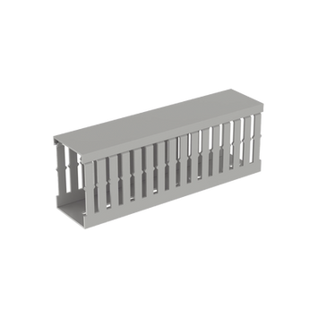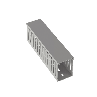 Canaleta ranurada de pvc MC50X75IG2, 2 m largo, 72.4 mm alto, 49.5 mm ancho, diseñadas con ranuras estrechas para alta densidad, color gris internacional. Fabricada en PVC libre de plomo con grado de inflamabilidad UL94V-0. Base y cubierta empacados juntos para facilitar la instalación.