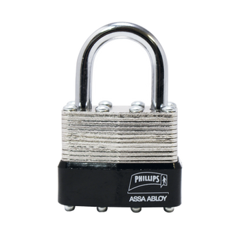 Candado Laminado MX2499 de PHILLIPS-ASSA ABLOY, con gancho de acero cementado y cilindro de latón. Cuenta con llave master y 4 pernos de combinación, incluye 2 llaves, y presenta un doble cerrojo. Ideal para mantener seguros tanques de gas, escritorios y más.