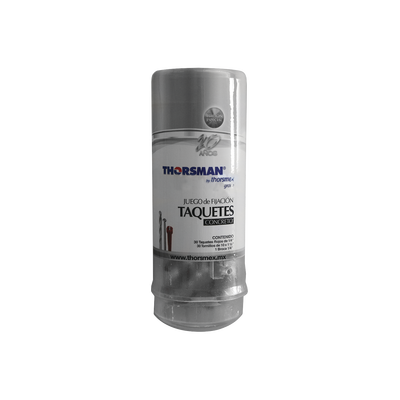 Juego de fijación TH-KITTP de THORSMAN, ideal para concreto y tabique. Temperaturas de operación: -50ºC a +80ºC. Carga recomendada: 60 kg (concreto), 50 kg (tabique). Incluye 30 taquetes rojos de 1/4%22 y 30 tornillos de 10 x 1 1/2%22. Doble expansión hacia los cuatro puntos cardinales y cuello que evita el hundimiento del taquete.