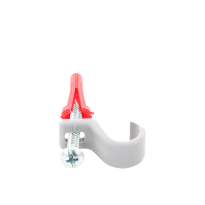Kit de sujeción TK-1420 de THORSMAN, material polietileno, color gris, temperatura de operación -10° a +120°. Incluye 8 grapas, 8 tornillos y 8 taquetes. Ideal para sujetar conductores redondos o tuberías en muros. Flexible y con orificio libre de rebaba, permite una fijación segura en interiores y exteriores.