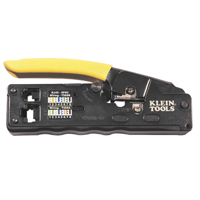 Ponchadora compacta VDV-226-107 de KLEIN TOOLS, con longitud total de 133 mm y peso de 318 g, diseñada para ponchar conectores RJ45 y RJ11/RJ12. Ideal para cables CAT3, CAT5e y CAT6, facilita la terminación de conectores de red de manera efectiva, con un diseño ergonómico que permite su operación con una sola mano y un mecanismo de matraca para una terminación precisa.