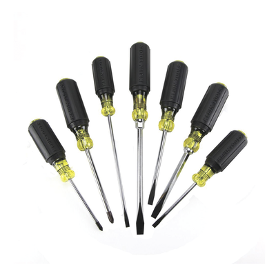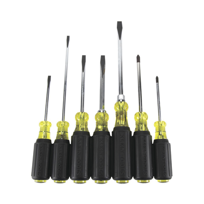 Juego de desarmadores 85076 de 7 pzas. de KLEIN TOOLS, que incluye 3 desarmadores de punta cabinet y 4 de Philips. Cuentan con mango acojinado, barra cuadrada de 1/4\%27\%27, 3/16\%27\%27 y 5/16\%27\%27. Este set es perfecto para usos generales, garantizando comodidad y durabilidad gracias al cromado de calidad superior.
