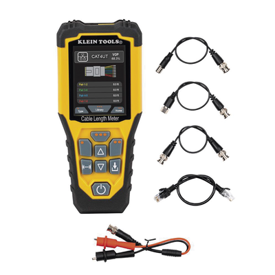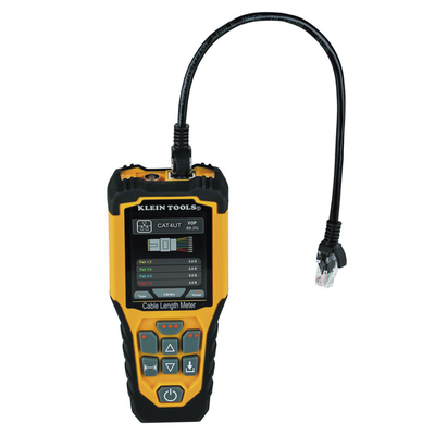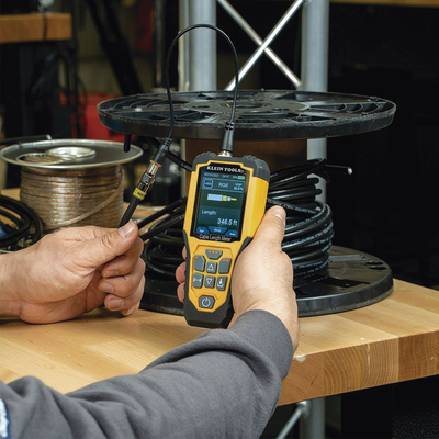 El medidor de longitud de cable Klein Tools es un probador portátil o Reflectómetro de Dominio Temporal (TDR, por sus siglas en inglés) basado en el método de Reflectometría. Dicho método funciona mediante la emisión de señales o impulsos eléctricos diseñado para medir el tiempo transcurrido entre el “pulso incidente” (inicial) y el “pulso reflejado” (final o eco). La diferencia de tiempo entre uno y otro se traduce en unidades de longitud (píes o metros y en unidades métricas o imperiales). El TDR permite de forma rápida y con gran precisión (+/- 2%), medir la longitud en cables eléctricos, de datos, de dos hilos y Romex® en un rango de distancia de hasta 914 m.