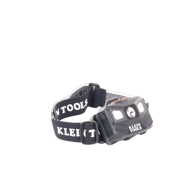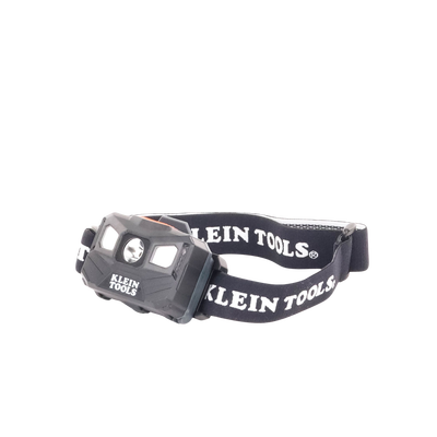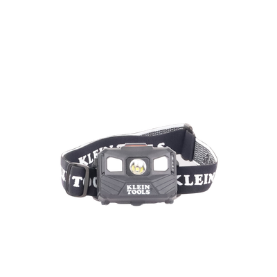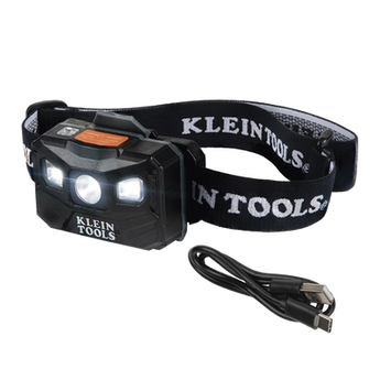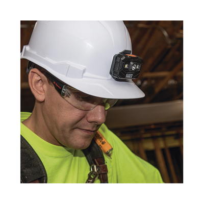 Lámpara LED frontal recargable 56048 de KLEIN TOOLS. Ofrece 400 lúmenes (modo total) y tres modos de operación. Tiene autonomía de hasta 22 horas y apaga automáticamente la luz en baja luminosidad. Compatible con cascos, resistente al agua con indicador de batería.