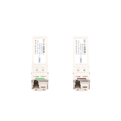 Transceptores ópticos bidireccionales LP-IND-SFP-BD-10G-20 10 Gbps 1270 1330 nm hasta 20 km conexión en caliente metal bajo EMI. Diseñados para fibra óptica monomodo, estos transceptores SFP+ son hot-pluggables y ofrecen una velocidad de transmisión de 10 Gbps. Con un conector LC Simplex, cumplen con las normativas DDM y RoHS y están fabricados en metal para minimizar el ruido EMI, operando en un rango de temperatura de -40 a 85 ºC.