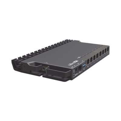 Router gigabit compacto RB5009UG+S+IN CPU 4 núcleos 1 GB RAM 9 puertos refrigeración pasiva. Este potente router cuenta con una CPU ARM de 4 núcleos, frecuencia de 350-1400 MHz, 8 puertos Gigabit y 1 SFP+. Ideal para cargas pesadas de CPU y diseñado para funcionar entre -40 °C a 60 °C en ambientes exigentes.
