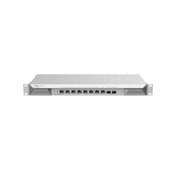 Router core balanceador RG-EG710XS de RUIJIE, con 1 puerto WAN y 8 puertos LAN/WAN Multi-gigabit, capacidad de transmisión de 3000 Mbps y soporte para hasta 700 clientes concurrentes. Diseño compacto y ligero para facilitar la instalación en racks.