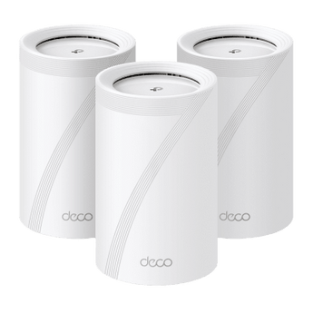 Kit de routers inalámbricos DECO-BE65-3PACK triple banda 10 Gbps con 4 antenas internas Wi-Fi 7, ideal para una conexión estable en toda la casa. Dimensiones: 107.5 x 107.5 x 176 mm. Cuenta con (4) Puertos 2.5G Detección Automática WAN/LAN y gestión mediante app (iOS/Android). Asegura Internet en toda la casa con red unificada y protección de la red gracias a Homeshield.