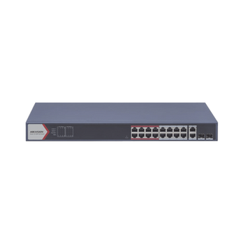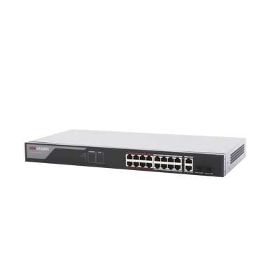 Switch POE+ DS-3E1318P-EI 16 puertos 10/100 mbps 2 puertos uplink 1000 mbps modo extendido 300 m aislado de puertos link aggregation. Este switch ofrece 16 puertos PoE 802.3af/at, 2 puertos uplink de hasta 1000 Mbps, y un modo extendido que permite conexiones de hasta 300 metros, optimizando la transmisión de video. Incluye características como aislado de puertos y gestión web a través de HikPartner Pro, facilitando la conexión y gestión eficiente de dispositivos PoE.