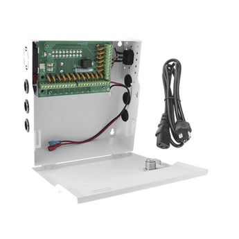 Fuente de poder PLK12DC20ABK, 12 Vcc, 20 A, ideal para videovigilancia y sistemas de CCTV. Cuenta con 18 canales de salida, voltaje de entrada de 96-264 Vca y protección contra cortocircuitos y sobretensión. Prolonga la vida útil de la batería.