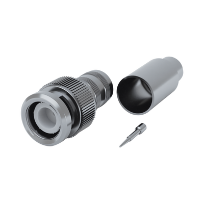 Conector BNC macho RFB-1707-D3 75 ohm níquel oro anillo plegable alta calidad. Impedancia de 75 Ohm, conductor AWG 23, modo de ensamble con anillo plegable. Fabricado en níquel con contacto de oro, ideal para cables RG-59/U. Conéctese de forma segura y fiable a sus equipos de video.