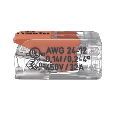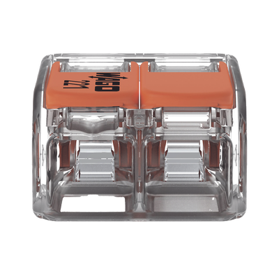 Borna de conexión WAGO 221-412, capacidad 4 mm², corriente máxima 32A. Diseño compacto y transparente, con palancas de accionamiento que facilitan conexiones seguras y rápidas. Compatible con cables AWG 24-12 y fabricada en policarbonato resistente (UL 94 V2). Ideal para instalaciones eléctricas.