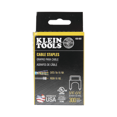 Paquete de 300 Grapas aisladas KLEIN TOOLS 450-002, ideales para sujetar cables coaxiales (RG59, RG6/6Q) y de datos (CAT3/5e/CAT6/6A). Fabricadas en acero y plástico, con un tamaño de 5/16\%27\%27 × 5/16\%27\%27 (8 mm × 8 mm). Certificadas por UL, proporcionan una sujeción segura y duradera en proyectos de cableado.