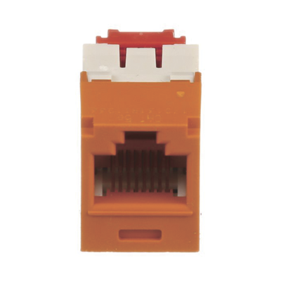Conector jack RJ45 CJ5E88TGOR categoría 5e de 8 posiciones y 8 cables, color naranja, ideal para aplicaciones de red. Tipo Mini-Com®, cumple ANSI/TIA-1096-A con contactos chapados en oro. Soporta 100 watts a través de HDBaseT, con terminación sin herramientas. Perfecto para entornos de -10ºC a 65ºC.