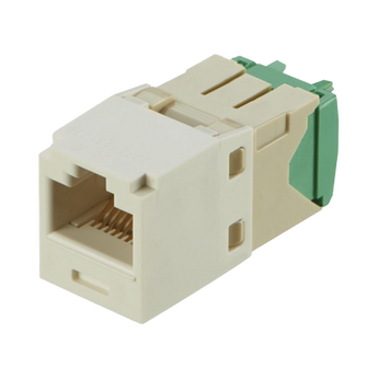 El módulo de conector UTP de categoría 6/Clase E, 8 posiciones se termina en un cable de par trenzado sin blindaje de 4 pares, 28 AWG sólido/trenzado y 30 AWG sólido de 100 ohms y no requiere el uso de una herramienta de impacto. Los módulos de jack UTP utilizarán un método de terminación de movimiento hacia adelante para optimizar el rendimiento manteniendo la geometría del par de cables y eliminando el destrenzado del conductor. La tapa de terminación tendrá un código de color verde para designar el rendimiento de Categoría 6 e incluirá una etiqueta universal codificada para los esquemas de cableado T568A y T568B.