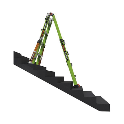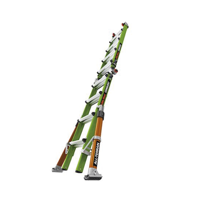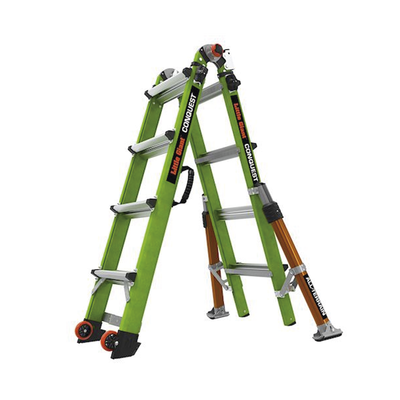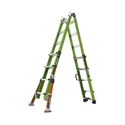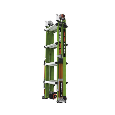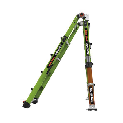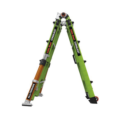 Más ligera, pero más fuerte que la fibra de vidrio promedio, la escalera Conquest 2.0 y Conquest All-Terrain están fabricados con fibra de vidrio no conductora Hi-Viz Green de Little Giant.