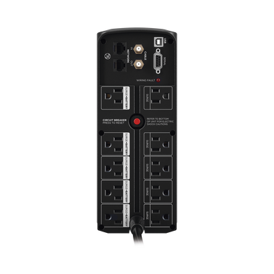 UPS 1500 VA CP1500AVRT 1500 VA 900 W 8 Tomas Protección de respaldo y regulación automática. Este modelo cuenta con un voltaje de entrada de 90 - 140V, 8 tomas NEMA 5-15R, salida de 900W, protección RJ11/RJ45 y una pantalla LCD para monitoreo.