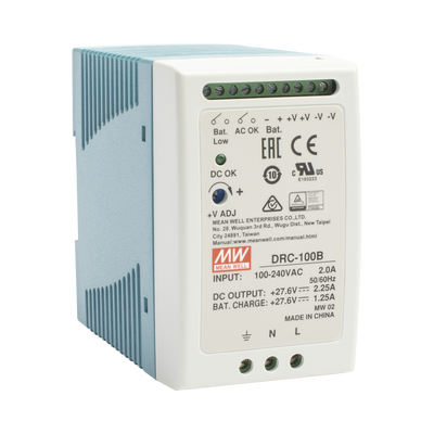 Fuente de poder 24v DRC-100-B 90-264vca 100w 87%25 eficiencia cortocircuito sobrecarga. Cuenta con voltaje de entrada de 90-264Vca, salidas de 27.6Vcc, corriente CH1: 2.25A, CH2: 1.25A (carga batería), potencia de 96.6W y dimensiones de 55 x 90 x 100 mm. Incluye protecciones de cortocircuito y sobrecarga, ideal para riel DIN.