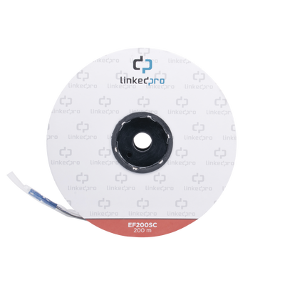 Carrete de fibra óptica monomodo EF-200-SC de 200 metros con conectores SC-SC duplex. Su fibra monomodo 9/125 permite una transmisión de alta capacidad. Incluye conexiones mecánicas para fácil ensamblaje y máximo 4 uniones. Su diseño ligero y portátil es ideal para instalaciones subterráneas por tubería y garantiza alta calidad de señal.
