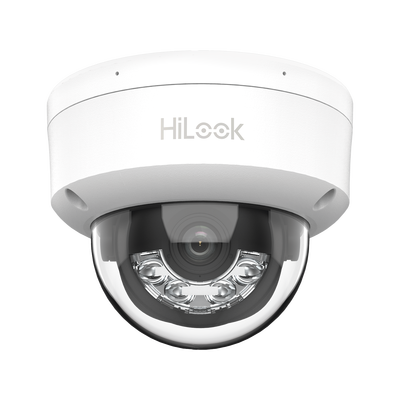 Cámara domo IP IPC-D140HA-LUC 4MP 20m IR 20m luz blanca H.265+ Smart IR. Esta cámara de HiLook ofrece una resolución máxima de 4 Megapíxeles, lente de 2.8 mm, visión nocturna con 20 m de Smart IR y luz blanca, así como tecnología 3D DNR. Ideal para uso en interiores y compatible con PoE.
