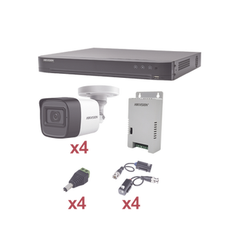 Kit de seguridad KH1080P4BW con 4 cámaras 1080p, DVR pentahíbrido, soporte de audio bidireccional y visión nocturna de 20 mts. Ideal para vigilancia y monitoreo remoto a través de Hik-Connect. Incluye transceptores y fuentes de poder para una instalación completa y eficiente.
