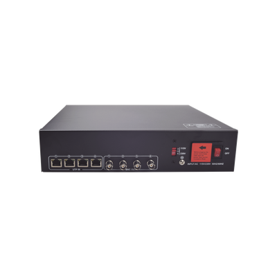 Kit de transceptor activo de 4 canales KITTT4PVTURBOX 150 metros 36Vcc compatible con cámaras HD transmisión en tiempo real 200 metros en 5MP. Funciona con alimentación de 110-220 Vca y consume 150 W. El receptor envía 36Vcc mientras que el transceptor regula a 12Vcc. Soporta transmisión de hasta 200 metros en 5MP, ofreciendo una instalación limpia sin cables sueltos.