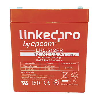 La Batería 12V 5.5Ah LK5.512FR de LINKEDPRO BY EPCOM es ideal para sistemas de alimentación de emergencia y alarmas. Esta batería AGM posee una capacidad de 5.5 Ah y una vida útil promedio de 5 años a 25°C. Certificada por UL, cuenta con terminales FI/F2 y material retardante a la flama. Además, su construcción sellada asegura un rendimiento confiable.