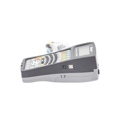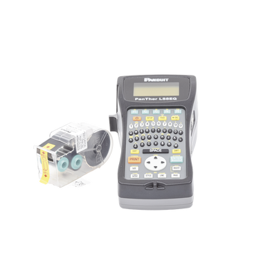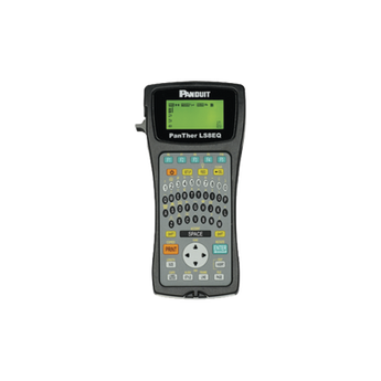 Impresora etiquetadora LS8EQ de transferencia térmica portátil PANDUIT, con conexión USB. Funciona con seis baterías AA y viene con un cassette de etiquetas auto-laminables S100X150VAC. Tiene un teclado QWERTY para un diseño rápido y funcionalidad de corte que ahorra etiquetas.