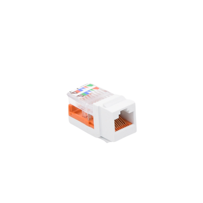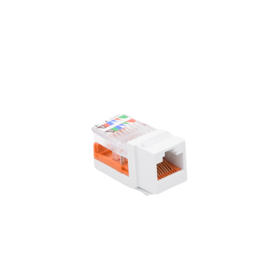 Conector jack NK5E88MWHY Cat5e 8 posiciones blanco, Tipo Keystone, ideal para instalaciones de red. Fabricado en cobre, compatible con T568A y T568B, este módulo cuenta con 8 posiciones, diseño compacto y asegura alta velocidad de transmisión, cumpliendo con la normativa RoHS.