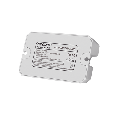 Fuente de alimentación PL0012, 12 Vcc @ 2 A, ideal para sistemas de iluminación LED. Voltaje de entrada: 110V - 240Vca, con 2 salidas de voltaje. Compacto y seguro gracias a su fusible de protección.