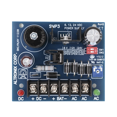 La fuente de alimentación / cargador Altronix SMP3  convierte una entrada de CA de bajo voltaje en una salida de 6 V CC, 12 V CC o 24 V CC. Esta unidad tiene una amplia gama de aplicaciones para accesorios de control de acceso, seguridad y sistemas de CCTV que requieren energía adicional.